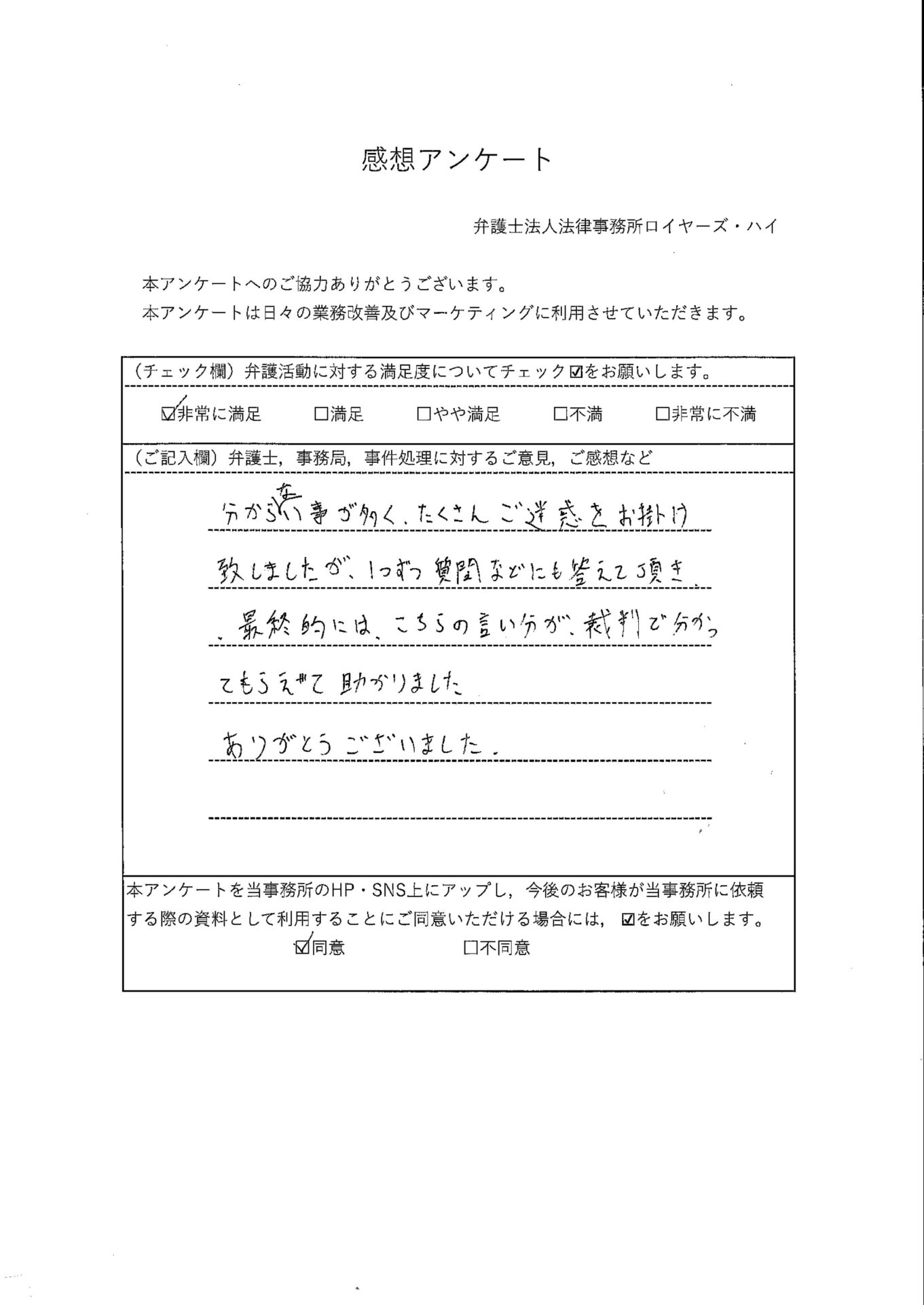 (30代 男性 会社員)「分からない事が多く、たくさんご迷惑をお掛け致しましたが、1つずつ質問などにも答えて頂き、最終的には、こちらの言い分が裁判で…」