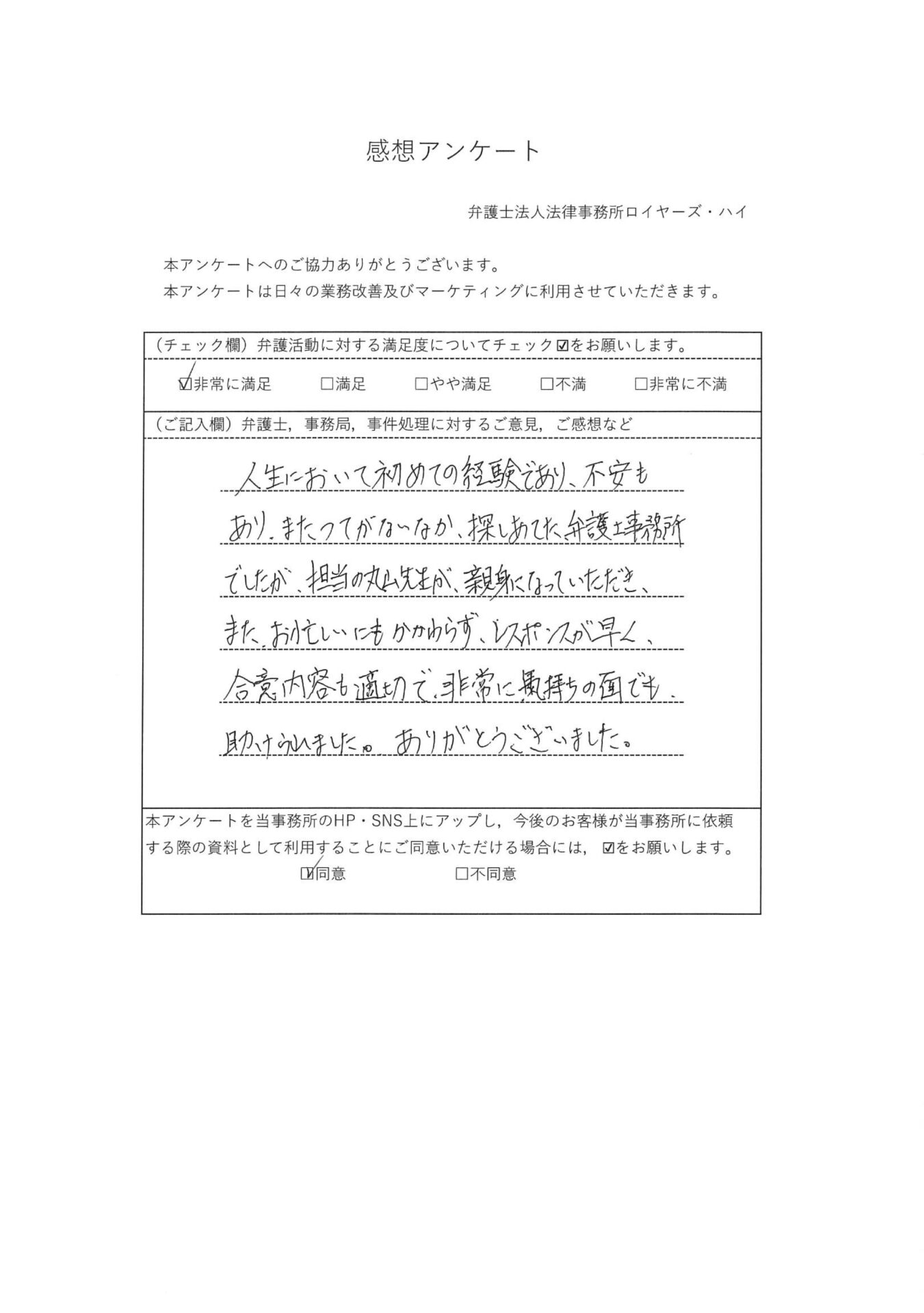 (50代 男性 会社員)「人生において初めての経験であり、不安もあり、またつてがないなか、探しあてた弁護士事務所でしたが、担当の丸山先生が親身になっていただき、また…」