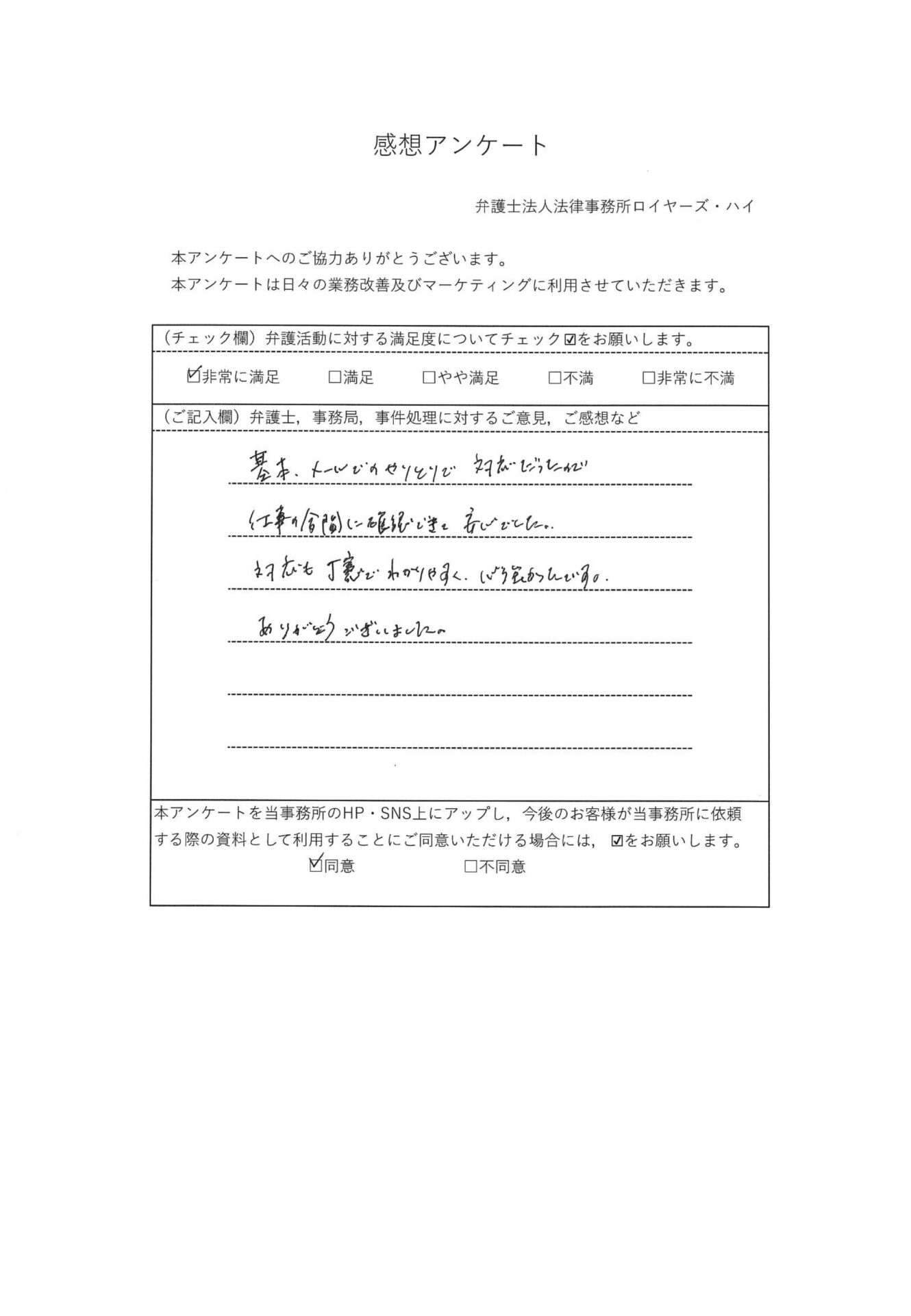 (50代 女性 会社員)「基本、メールでのやりとりで対応だったので、仕事の合間に確認できて安心でした。対応も丁寧でわかりやすく、心強かったです。ありがとうございました。」 【口コミ】- 不倫の慰謝料に強い大阪(なんば・梅田)の弁護士法人 ロイヤーズハイ